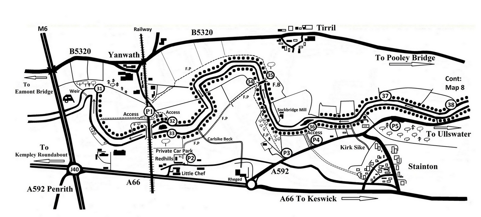 PLEASE NOTE: Access to the right bank between markers 36 and 38 in this area is achieved by wading across the river from the left bank only, THERE IS STRICTLY NO ACCESS ACROSS FARMLAND FROM THE TIRRIL TO POOLEY BRIDGE ROAD TO THE FIELDS BETWEEN 37 AND 38 ON THE MAP.